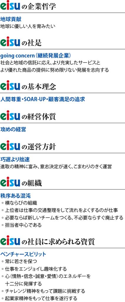 私たちは人でなければできない最高位の仕事についているのだ。単に1つの商品が移動して取引が終了するのと異なり、もっと永続的なもの、自分の話し伝えたこと、教えたことが、その生徒の一生を左右するかもしれないというぐらいの責任感と自負心とが必要とされる世界にいることを全員が自覚しなければならない。基本理念である「顧客満足の追求」を至上の課題として全員が取り組み日々実践しよう。そうした本物のサービスを全うしてはじめて、同じく基本理念である「SOAR-UP」、並びに「人間尊重」ができ、後顧の憂いなく自己実現ができるのだ。厳しい表現となるが、実践できない人は「eisu」を離れるべきである。なぜならば、私たちは未来を担う子供たちの「知」を育み、「心」を育てる”教育”を業としているのだから。その「心」に嘘があってはならない。
